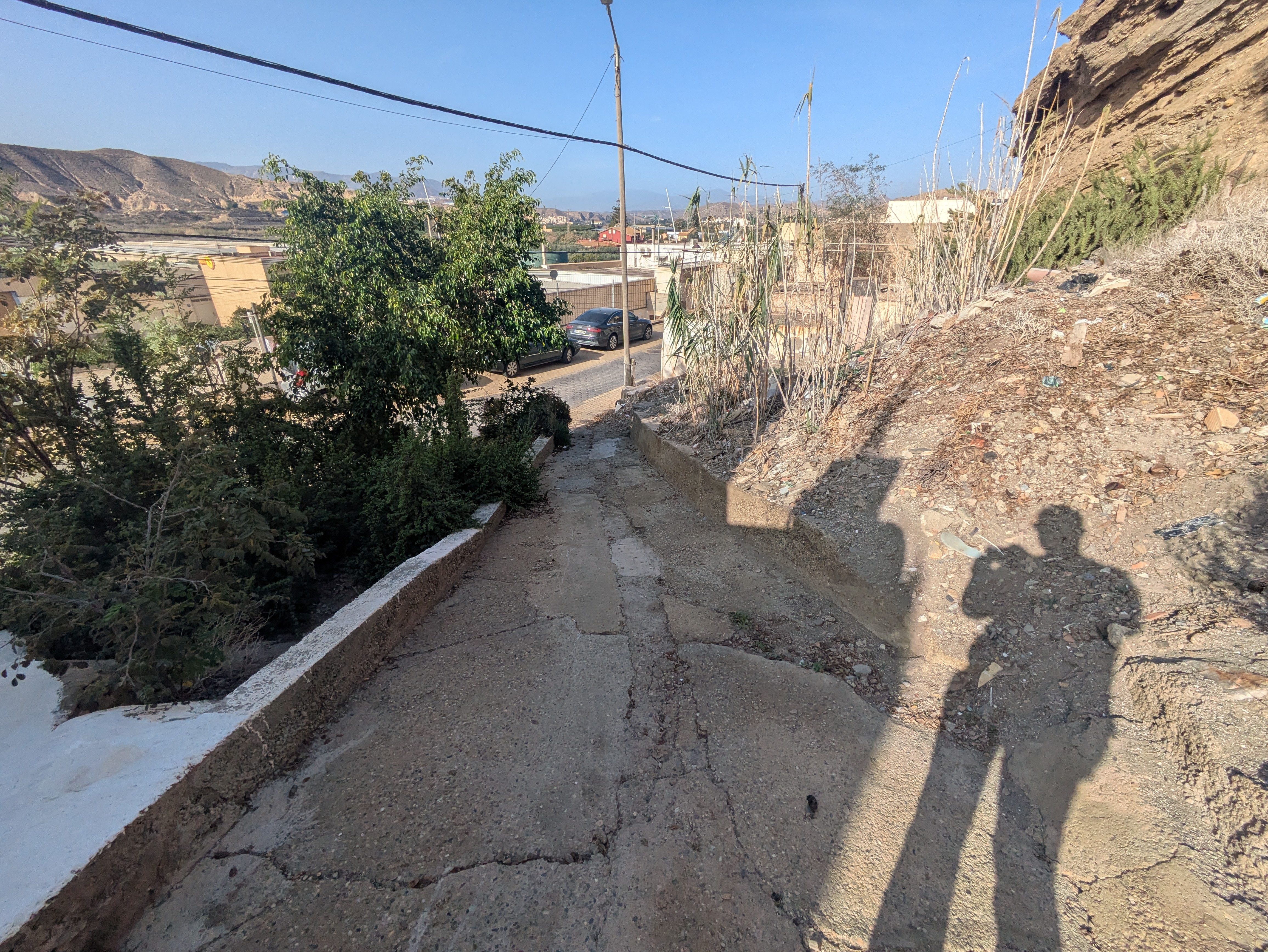Calle Peatonal en pendiente, pavimentada irregularmente, sin acerado y sin alumbrado público. En mal estado de conservación.